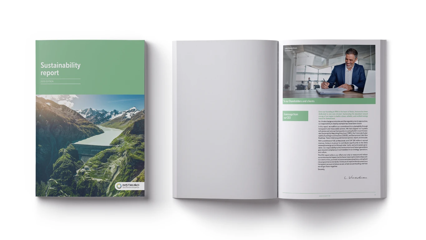 Instauro is a fictitious renewable energy company based in Switzerland. I decided to design their brand identity and apply it to their upcoming ESG report for 2025.
